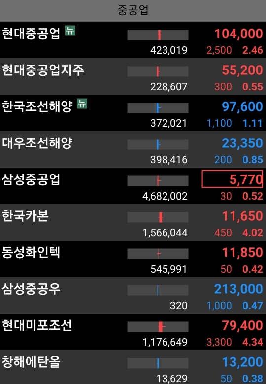 ●조선주, 자동차주는 오전부터 계속 상승 중.
