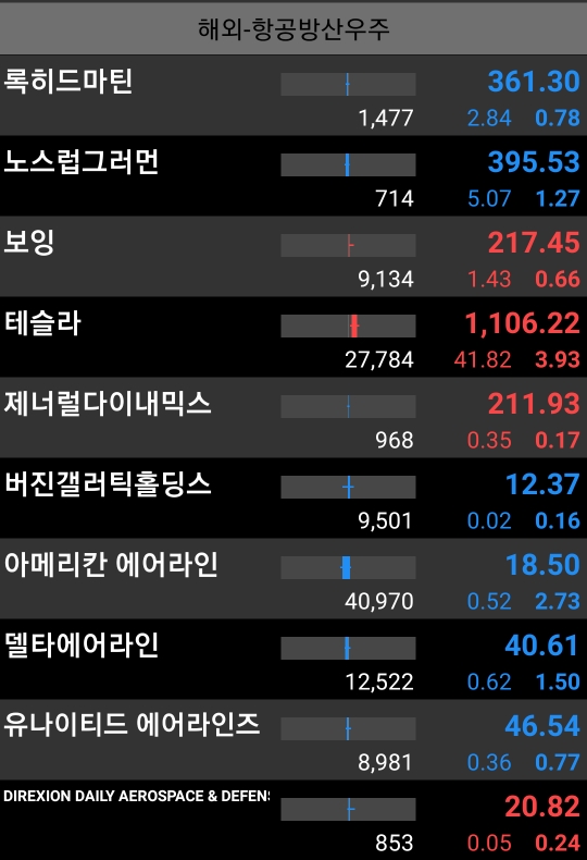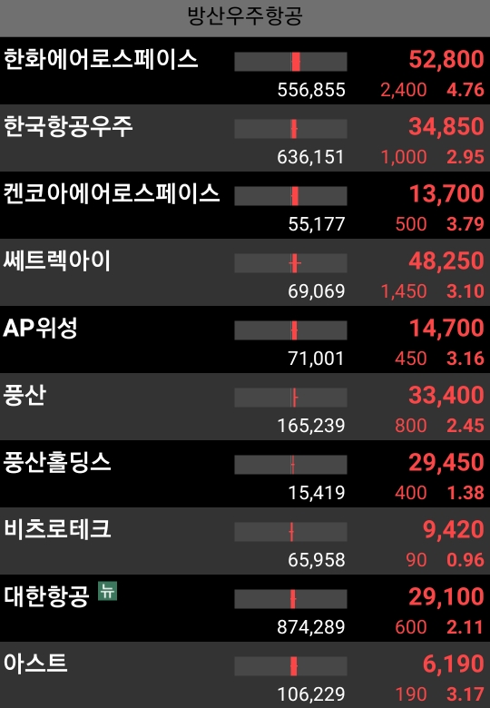 ●한국항공우주, 한화에어로, 켄코아에어로 상승. 특히 한화에어로 최근 좋은 움직임 보이며 오늘 5%근접하는 상승 중