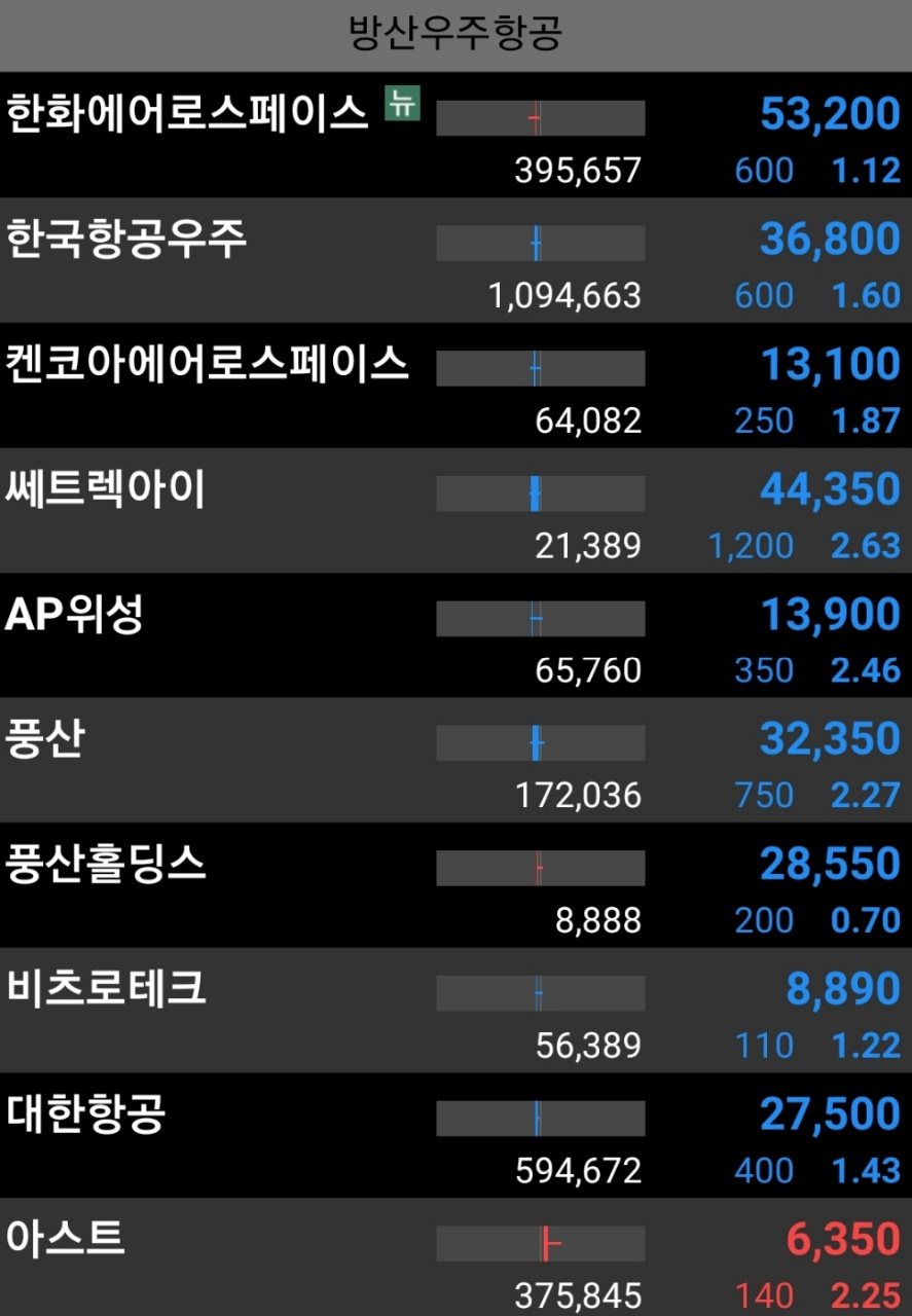 -어제까지 급등하던 항공우주, 방산주, 오늘은 하락장 역행하지 못하고 시장 따라 줄줄이 하락.