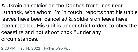 개인 트위터를 통해 전달되는 내용이고, 우크라이나에서는 '어떤 상황에서도 반격하지마라' 라는 명령이 있는 것으로 보입니다. (비공식 채널)