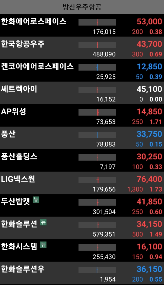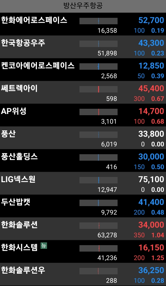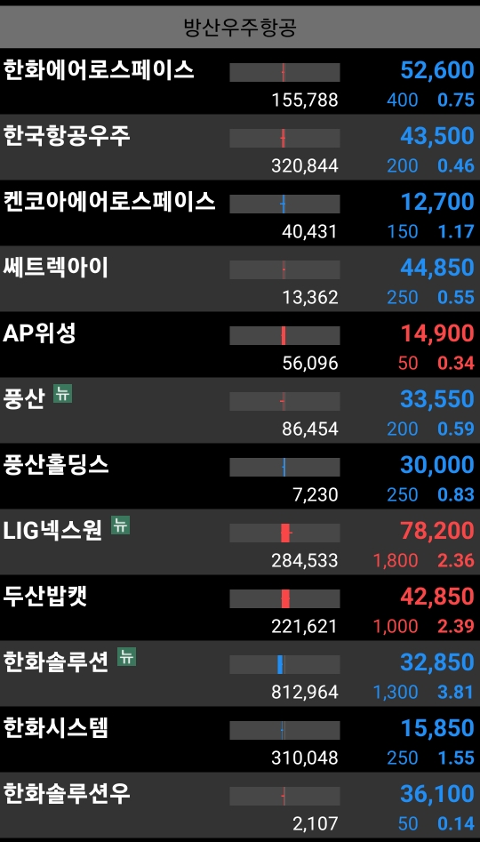 한국항공우주, 한화에어로, 켄코아에어로 등 모두 하락 마감.