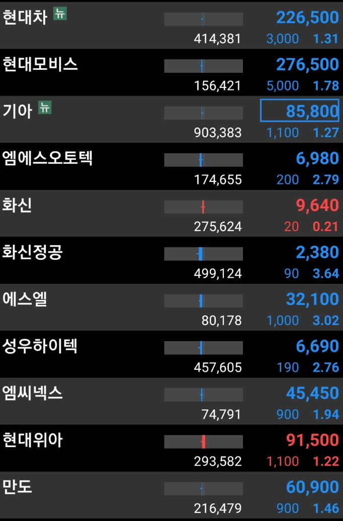 부록:자동차 관련주 - 철판을 이용하는 화신과 현대위아만 소폭 상승하며 방어중